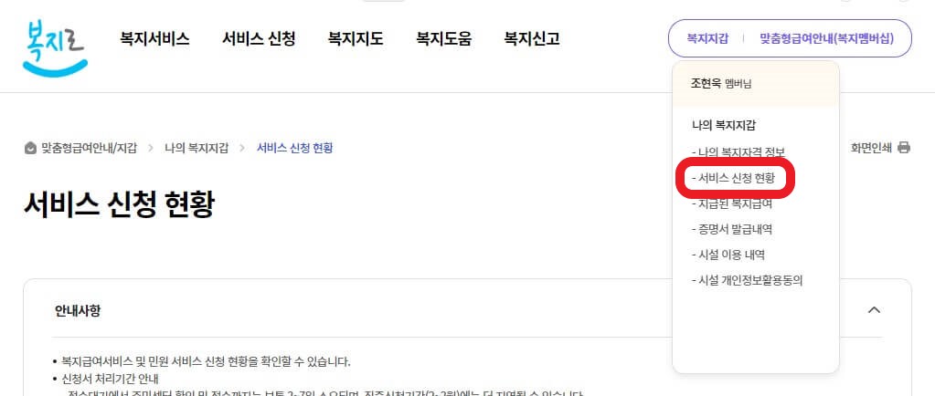 복지로에서 [복지지갑] - [서비스 신청 현황]을