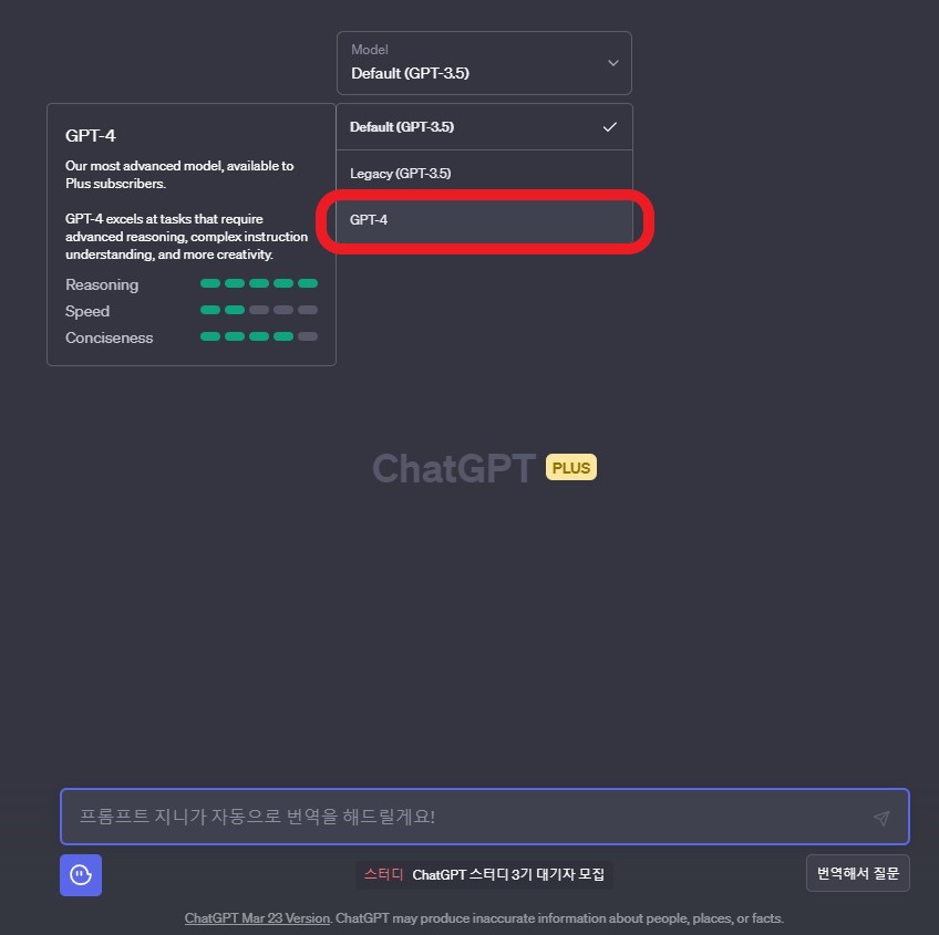 - GPT-4 : 가장 최신 응답 모델이며 더 정확하고 빠른 응답을 얻을 수 있습니다.