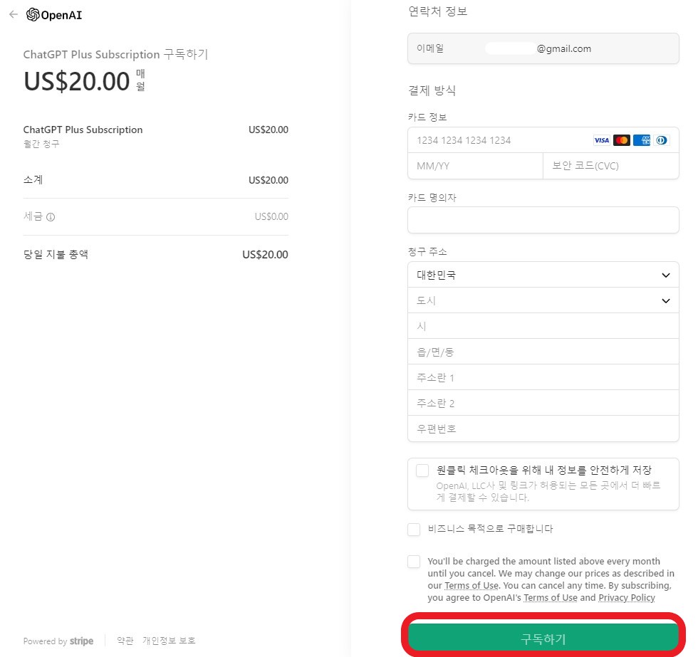 4. 카드 정보와 주소를 입력하시고 구독하기를 눌러주면 이제 '챗GPT PLUS'를 사용할 수 있습니다.